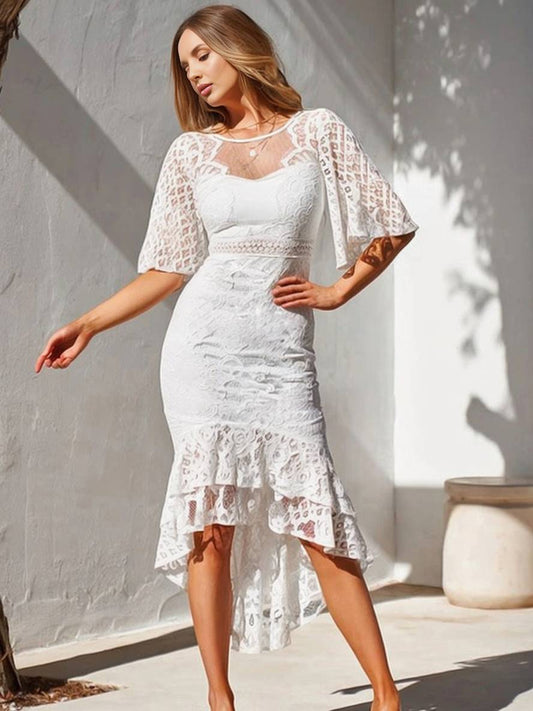 Zaprada long lace swallowtail mermaid dress with round neckline, trumpet sleeves, and short sleeves for women, elegant wedding guest attire