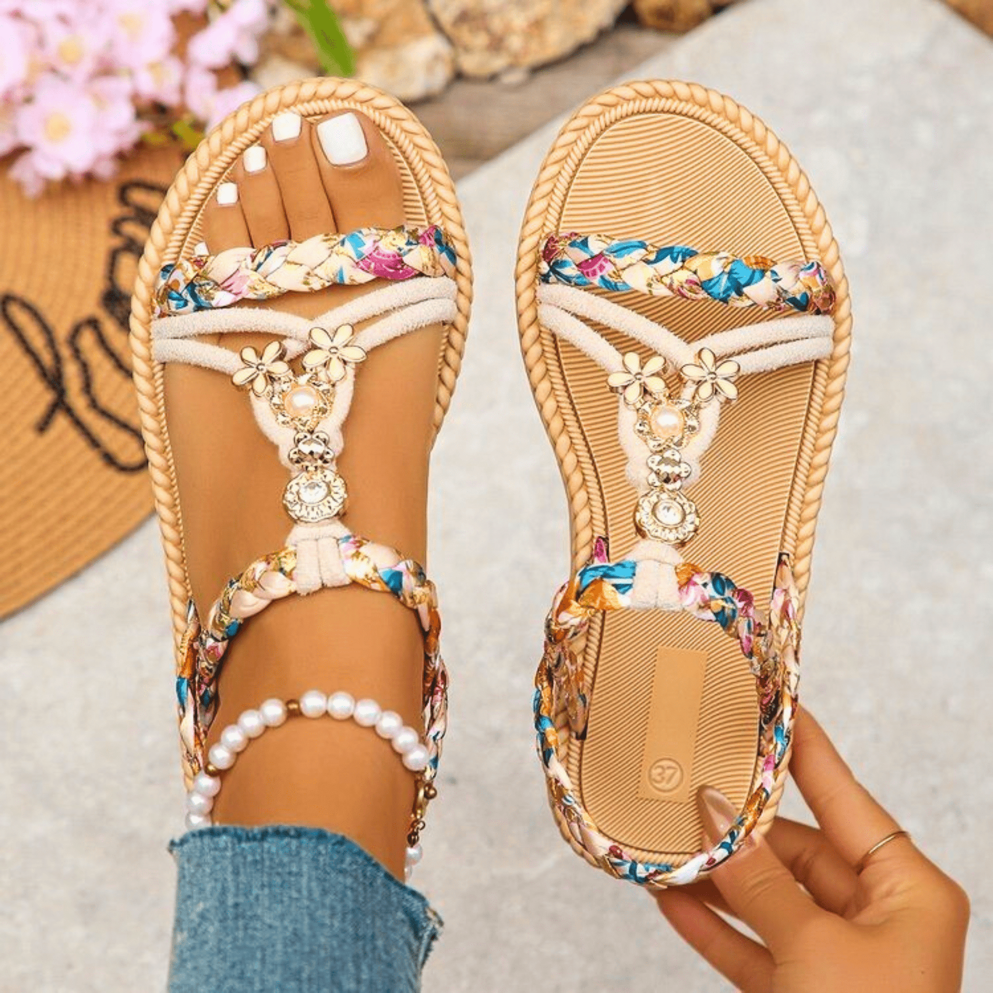 Featuring braided straps, floral accents, and shimmering crystal details that elevate every outfit. Designed with a cushioned insole and elastic back strap, they offer all-day comfort and an easy, secure fit.