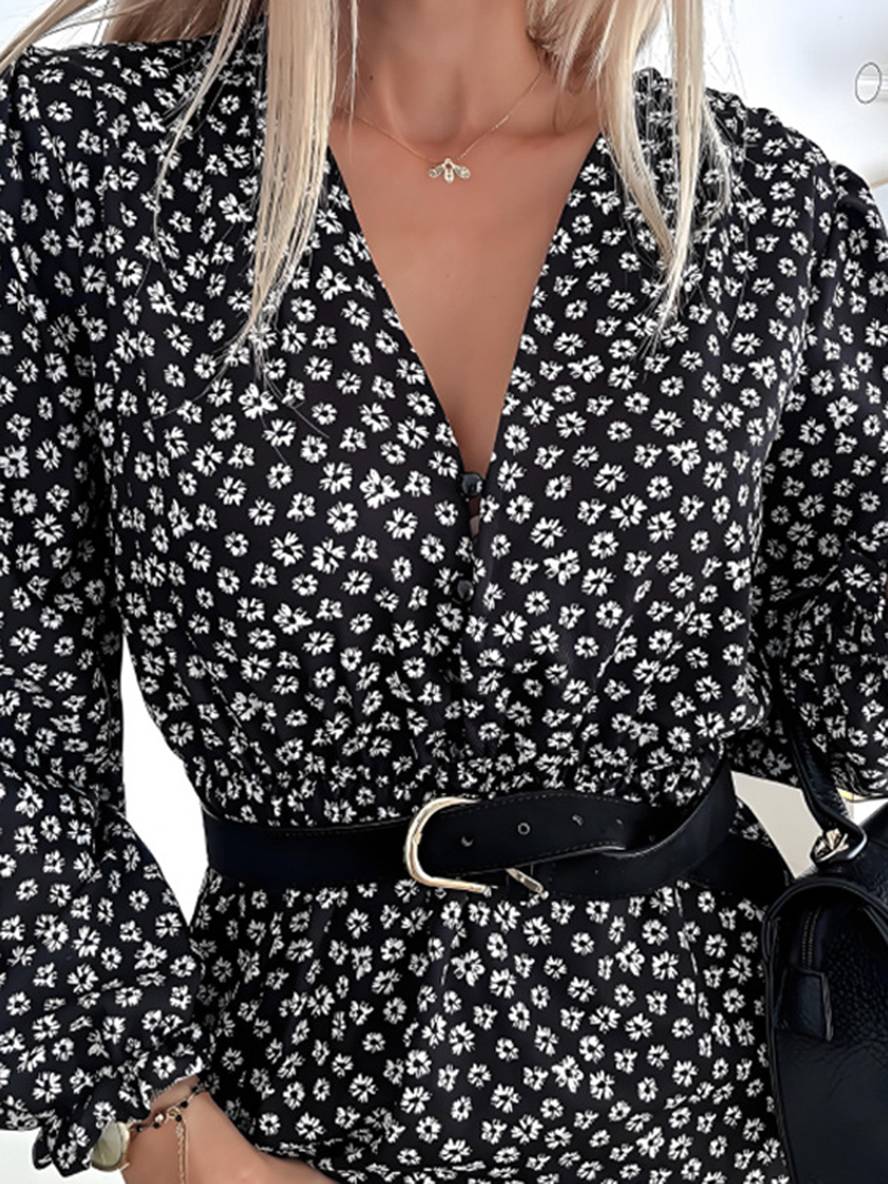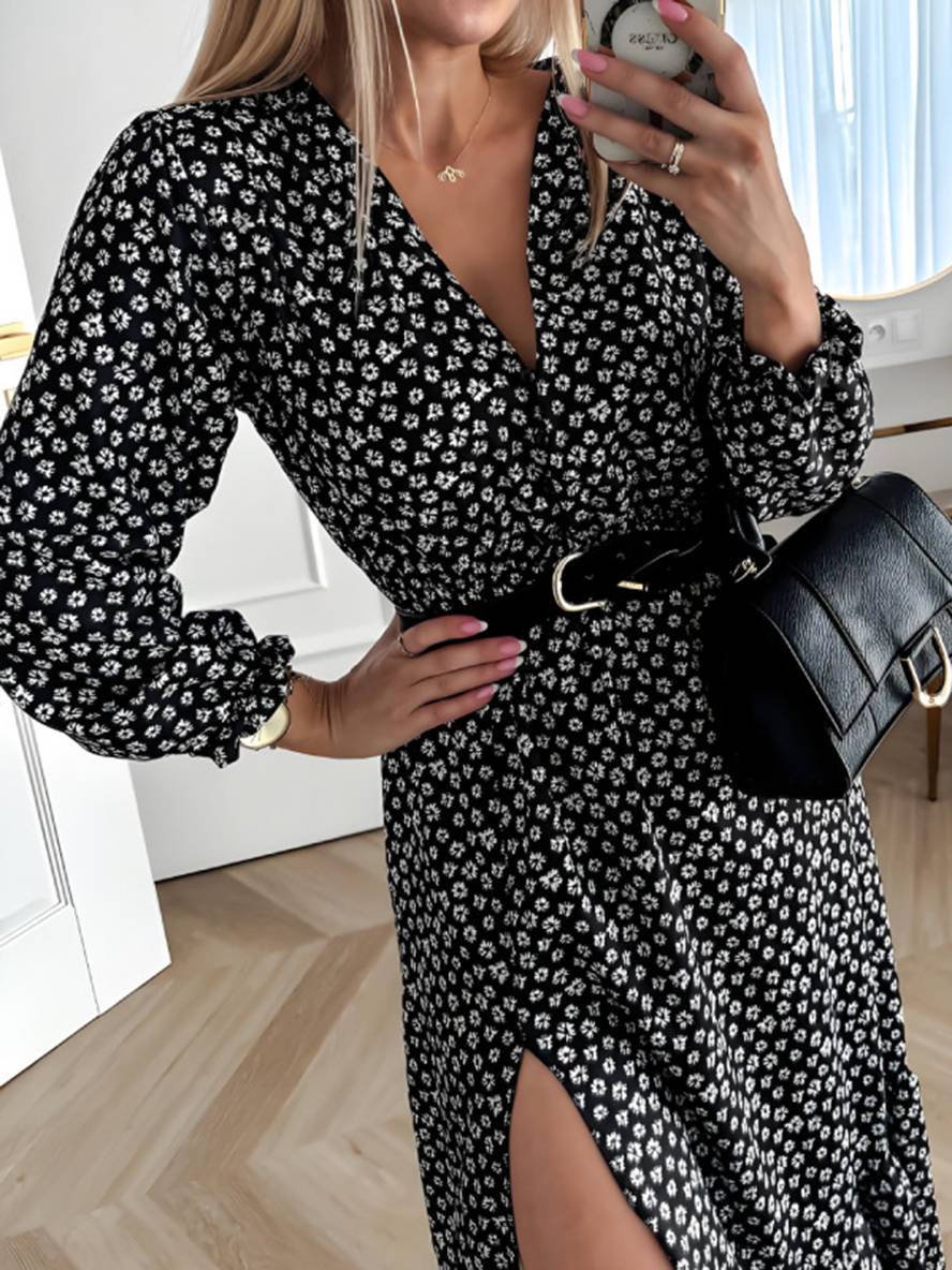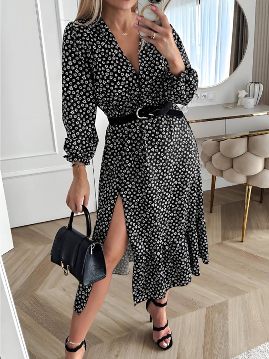 This dress features a classic black and white floral pattern, showcasing an elegant and chic vibe. The V-neck design highlights the neckline, adding a touch of sensuality and modernity. The puff sleeves add softness and lightness to the dress while balancing the sexy V-neckline, making it suitable for daily wear. The addition of a belt accentuates the waistline and adds stylish layering, enhancing the fashionable look. The mid-waist design and side slits flatter the feminine curves, while providing an elegant and comfortable fit. The polyester and spandex fabric offers great elasticity and comfort, ideal for fall and winter seasons. Whether it’s for prom, a night out, or a casual day look, this dress will highlight your unique style and charm.
